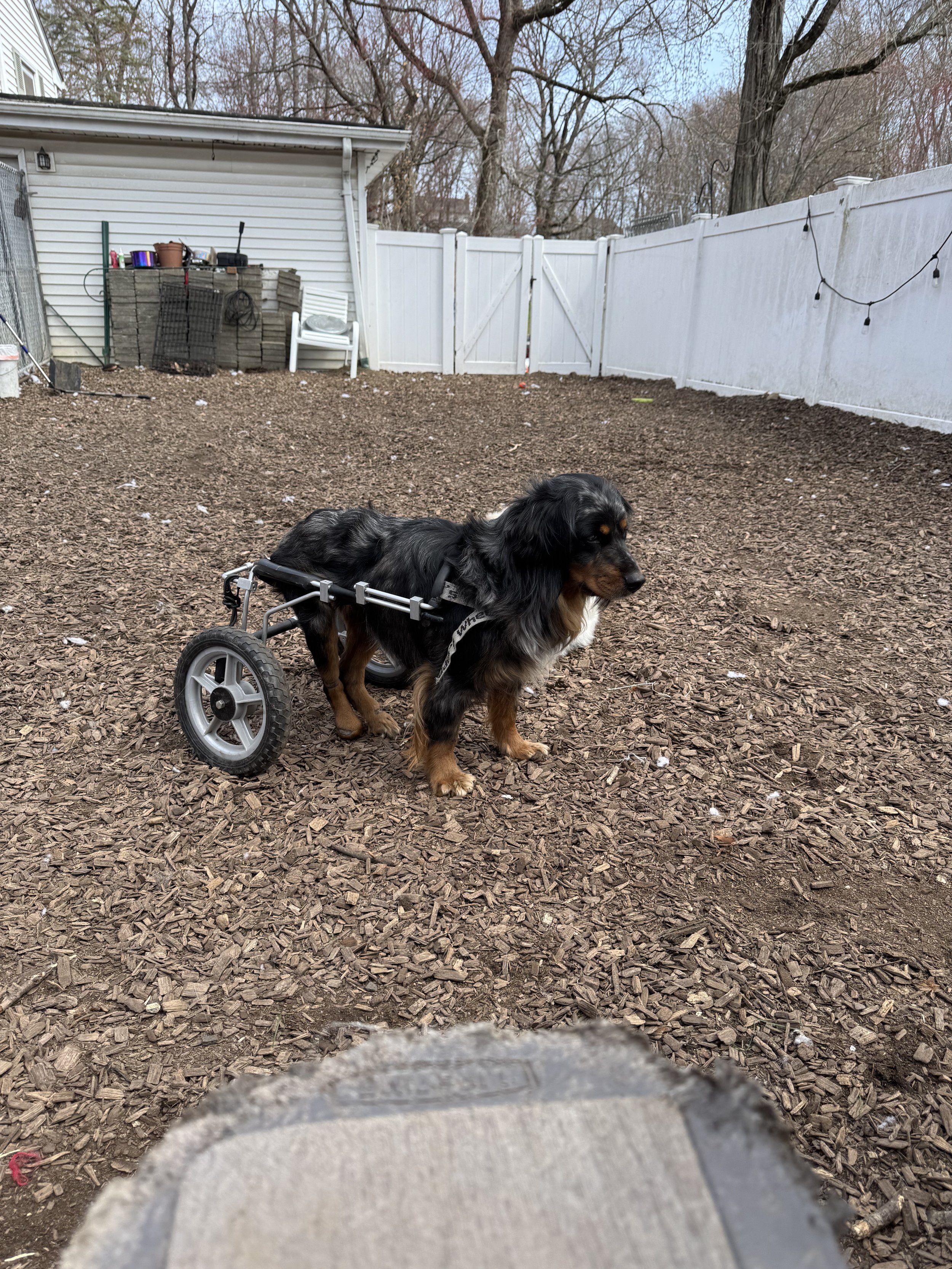 Lilo was hit by a car . She is paralyzed in the hind end. We think she is a mini aussie mix. She tolerates the other dogs but prefers humans over friends. She loves to go for walks in her cart.